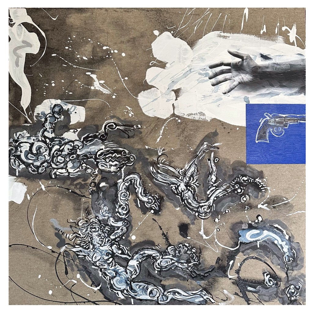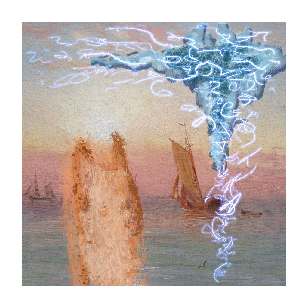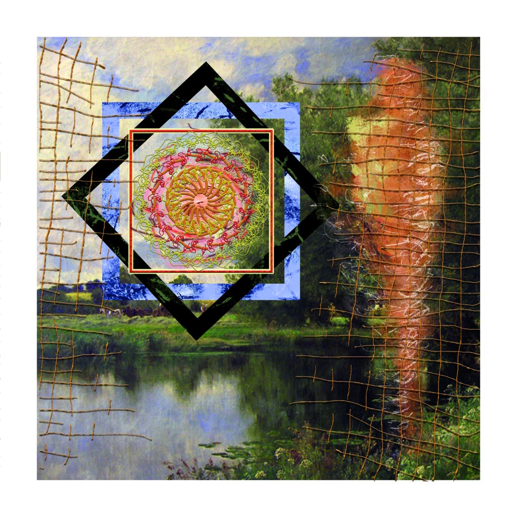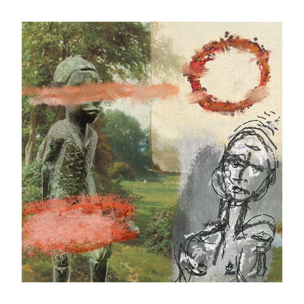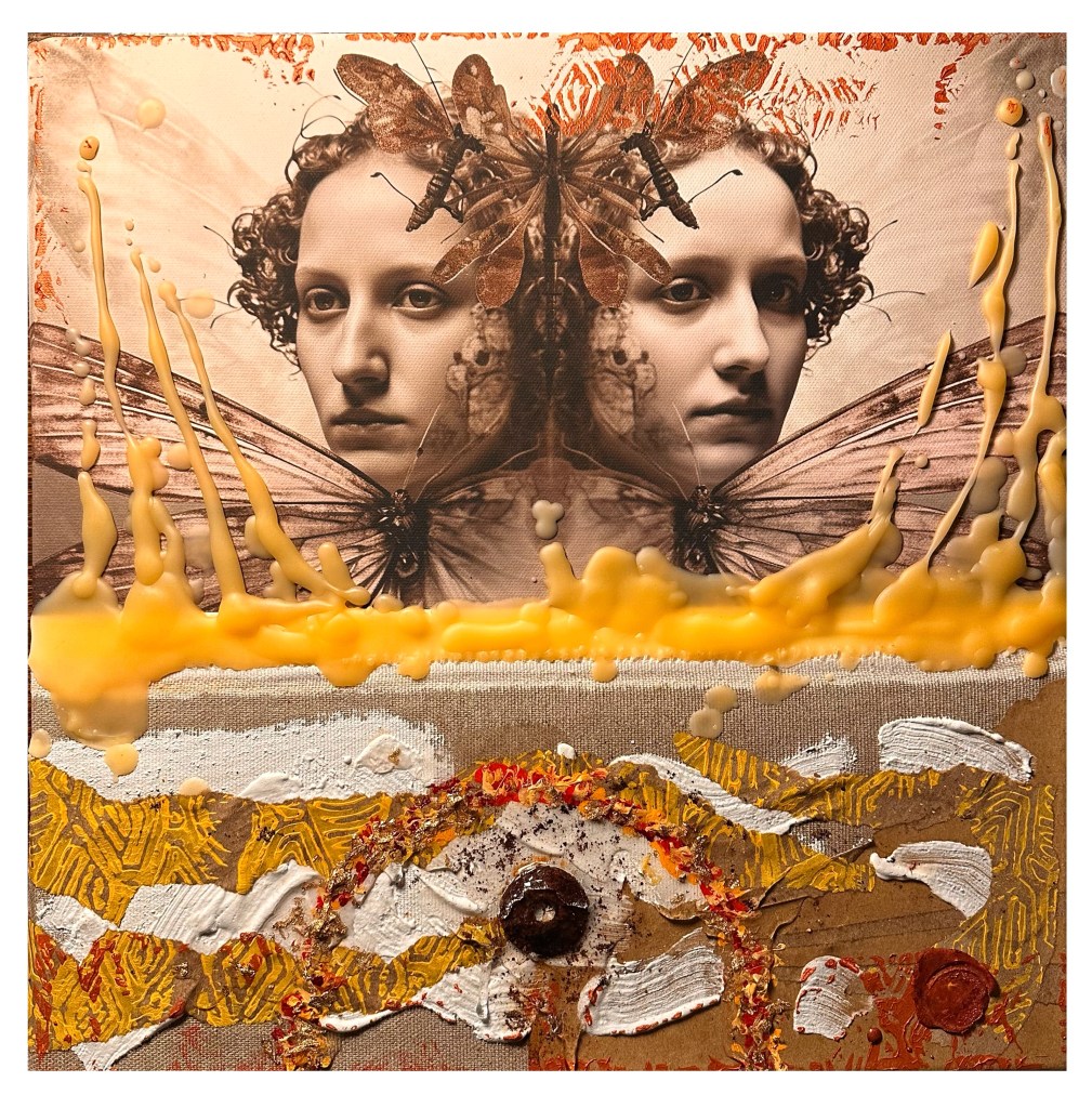 AI Digital Image on canvas with mixed media. 14 x 14″. Produced for the cover image of a musical project that can be found HERE.