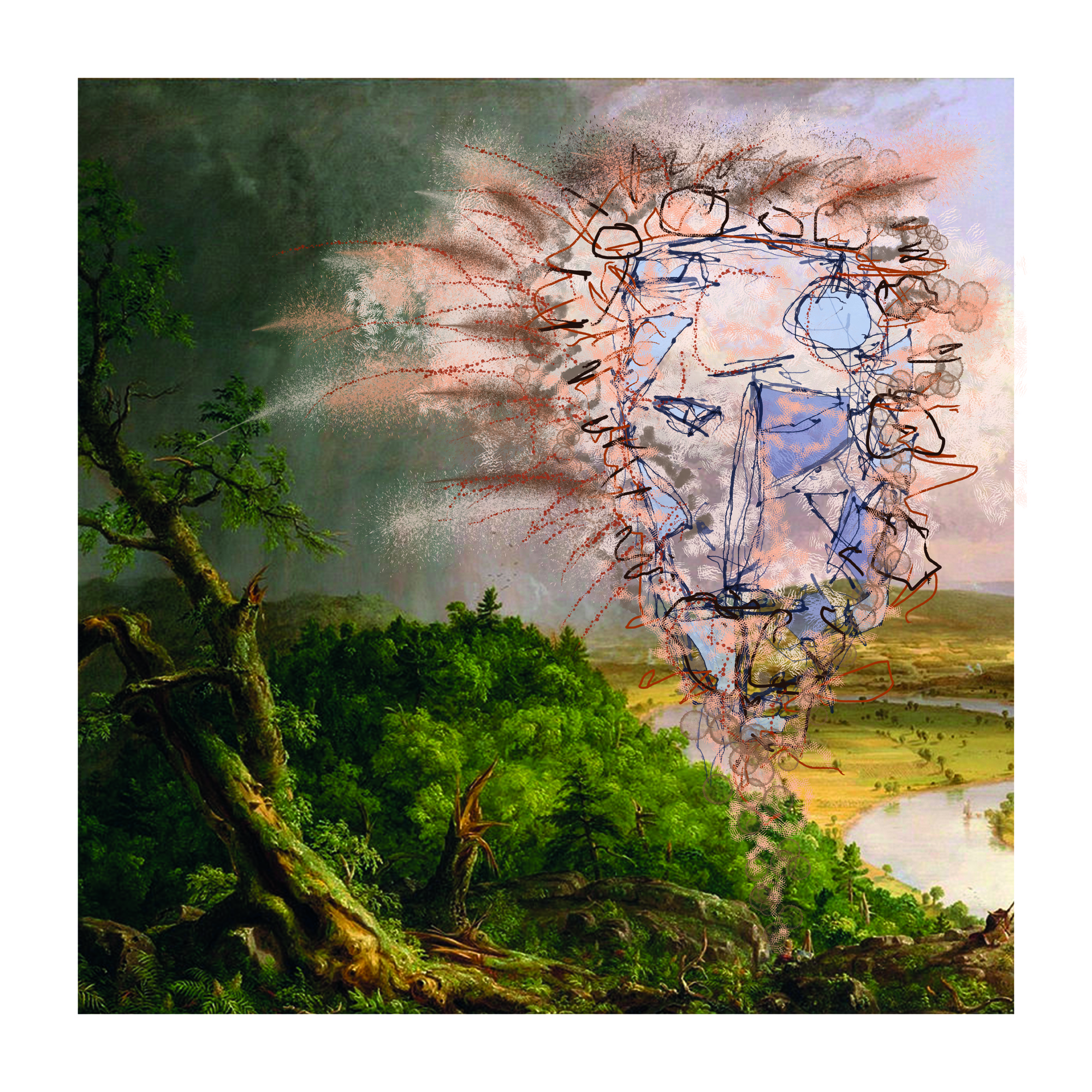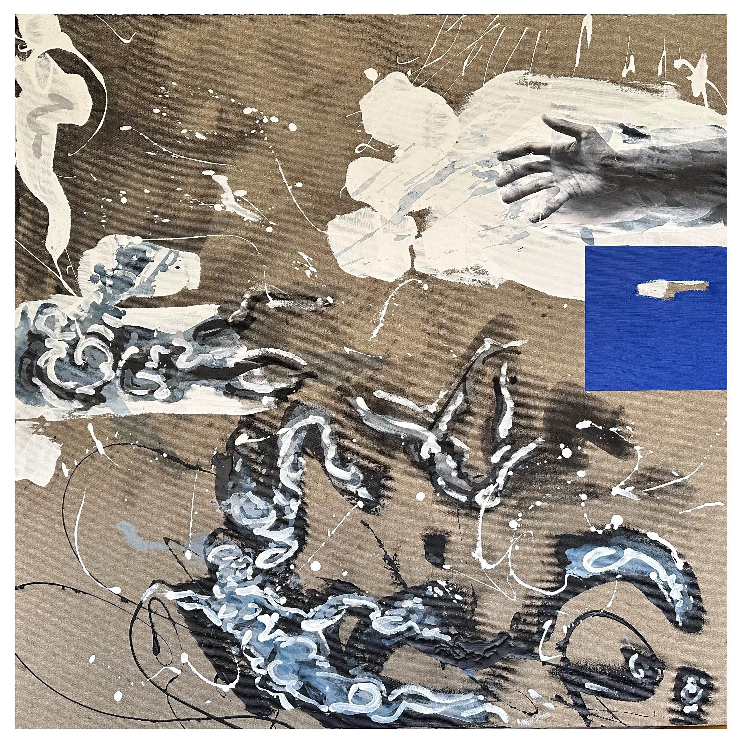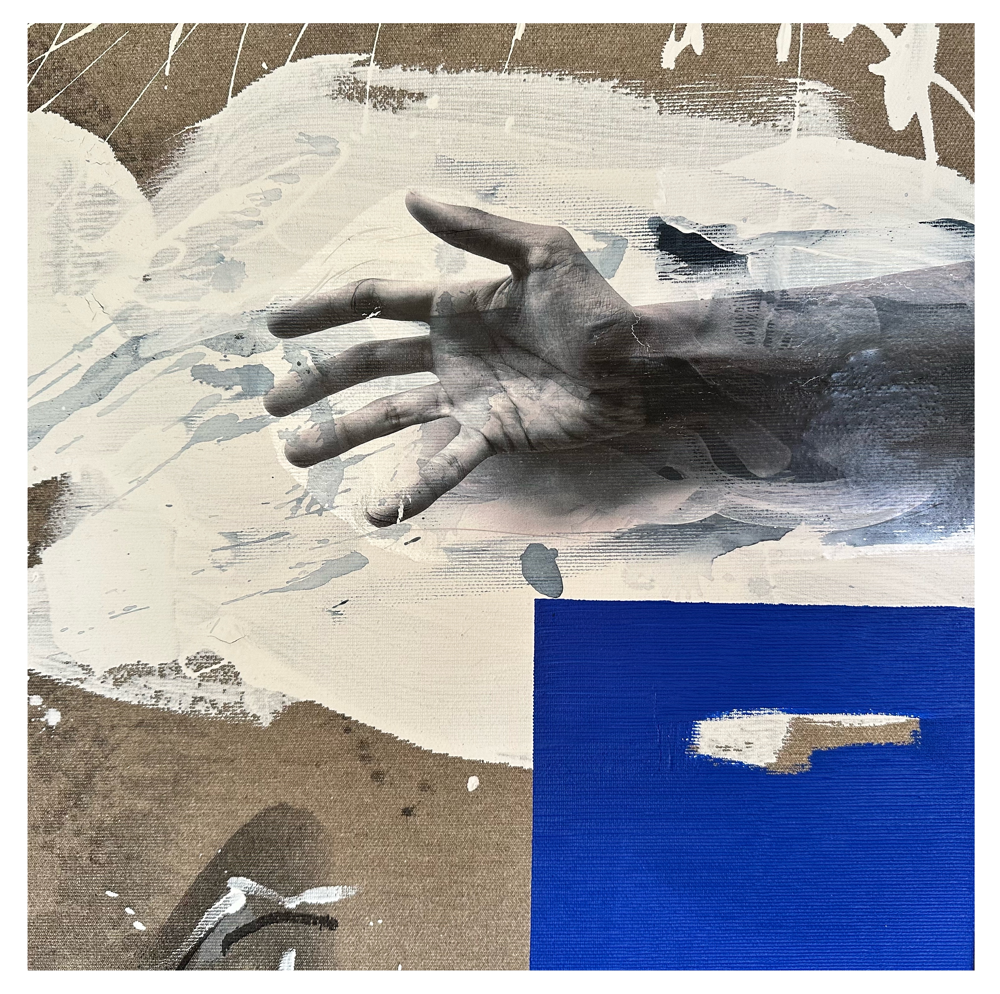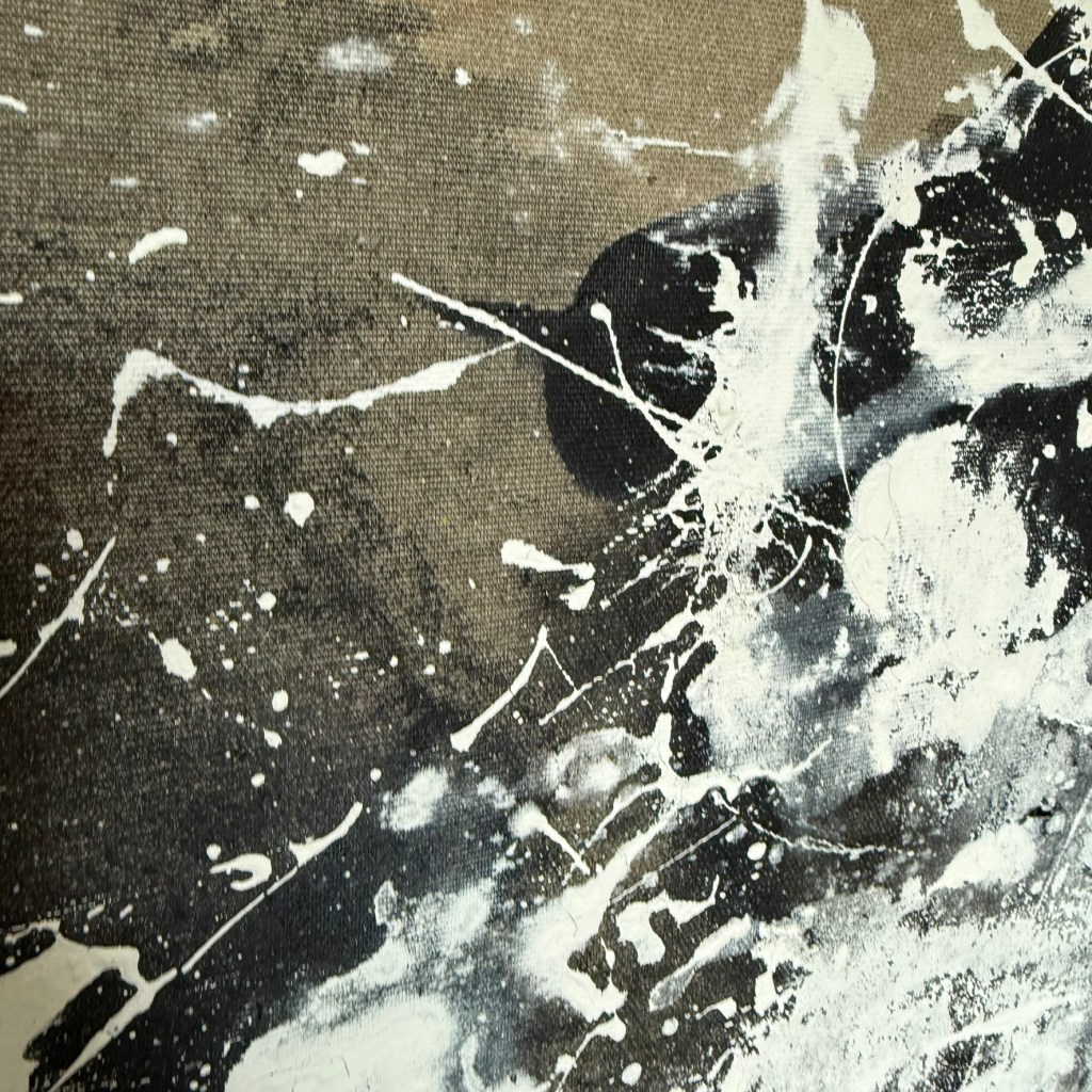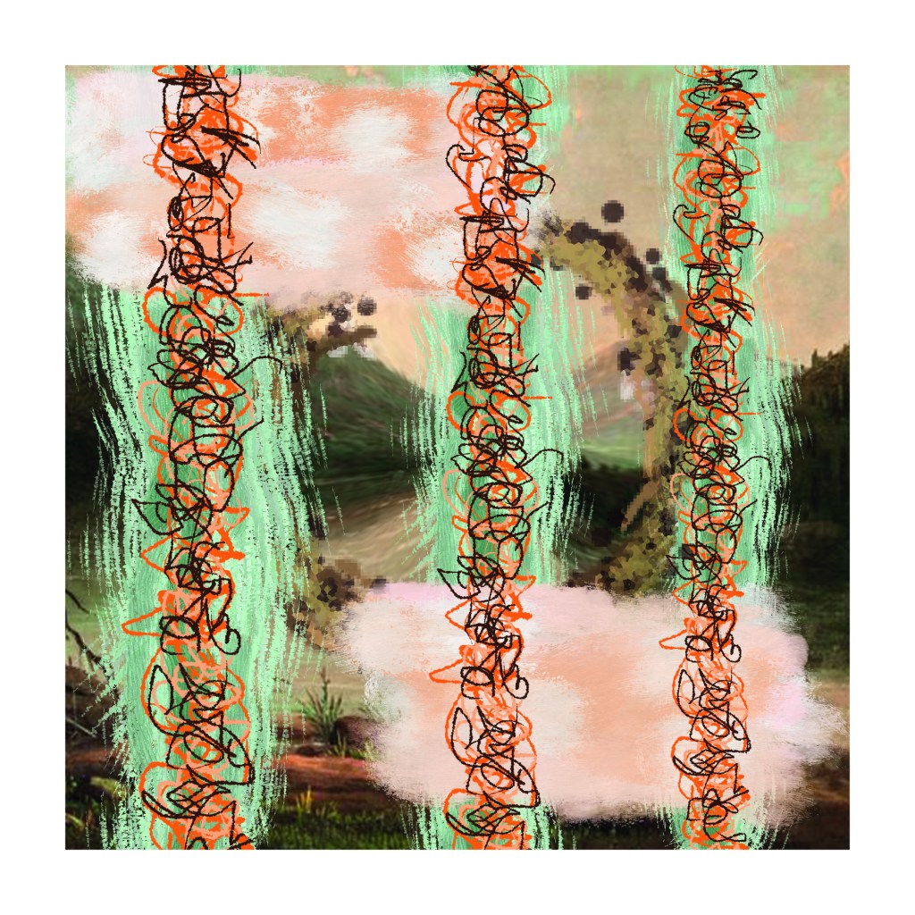 AI Digital Image on canvas with mixed media. 14 x 14″. Produced for the cover image of a musical project that can be found HERE.