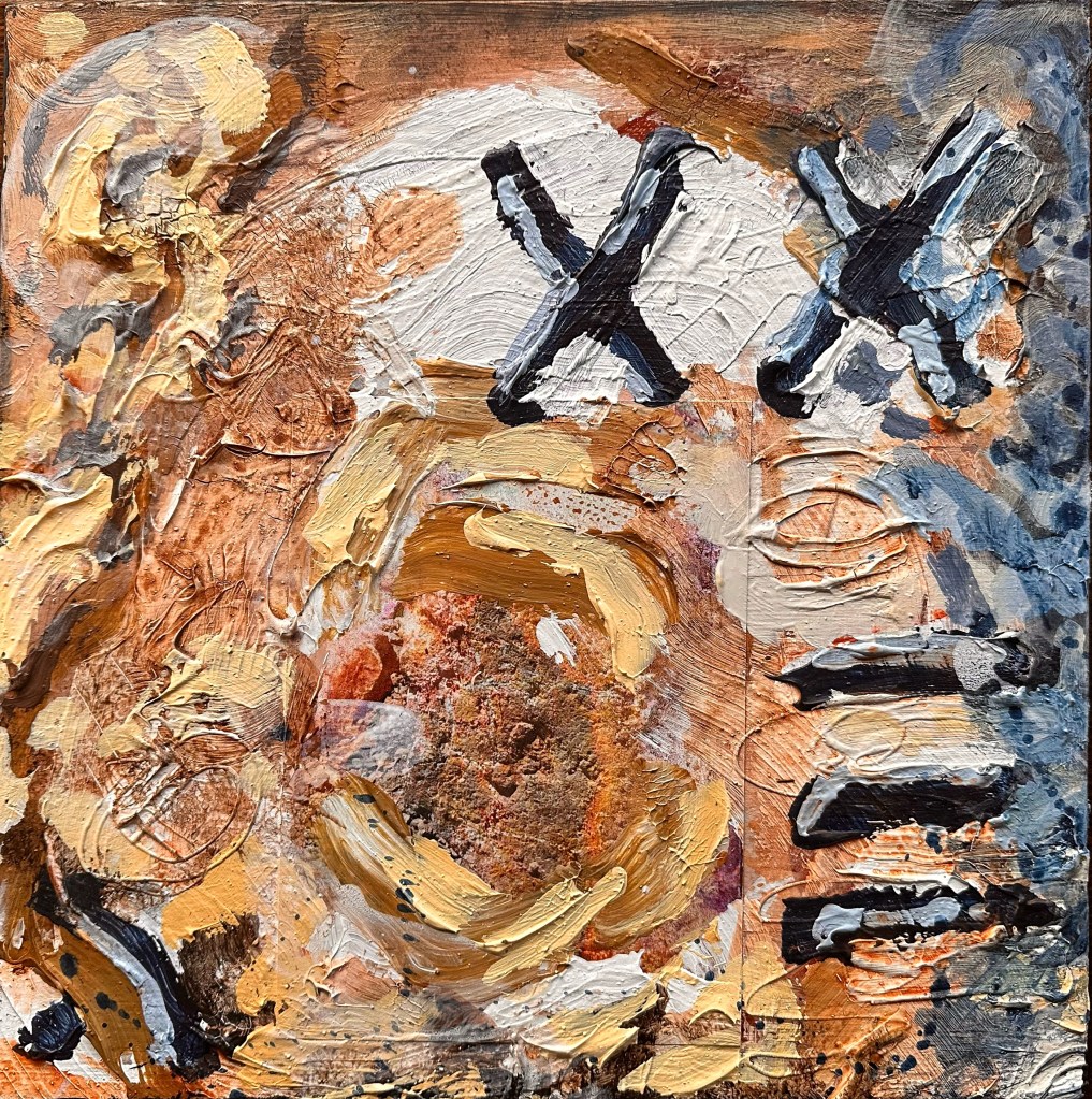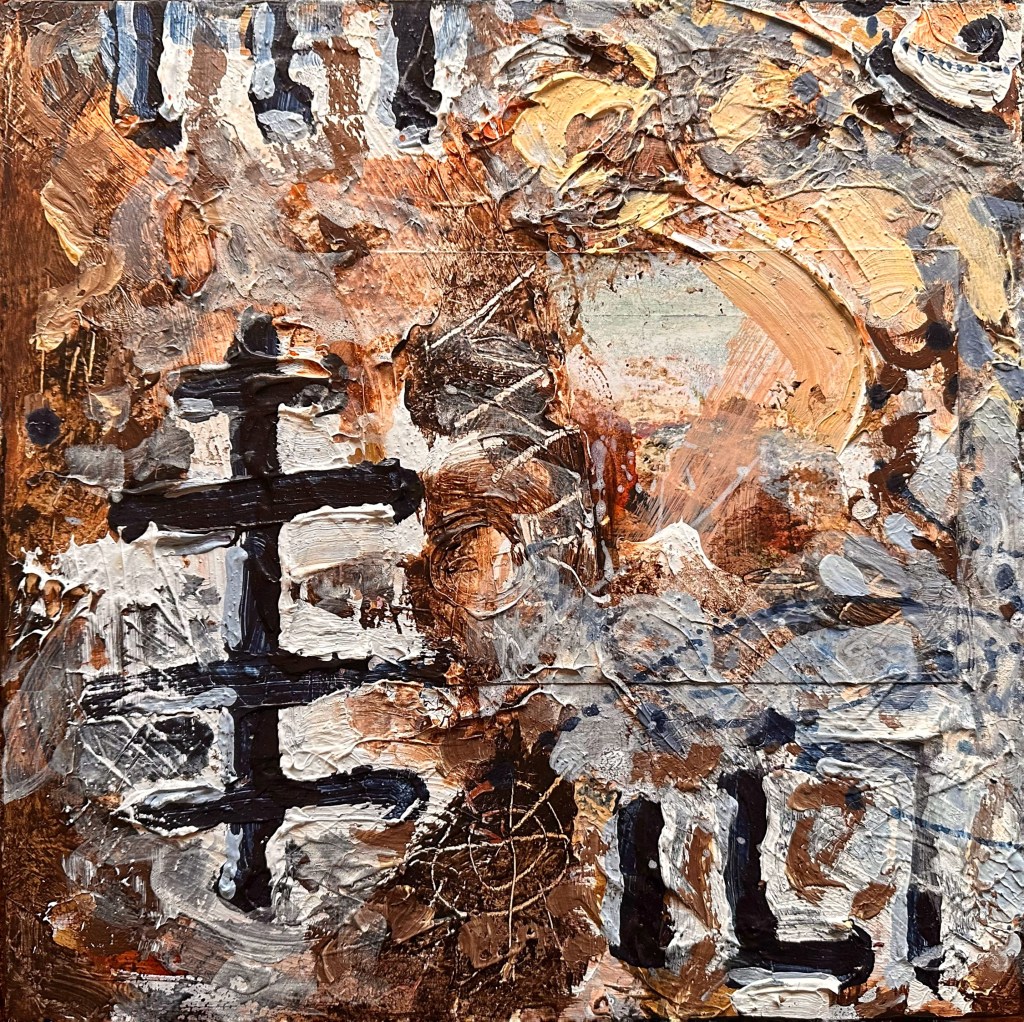 Triptych. Mixed media on canvas. Left & right 14 x 14″, centre 22 x 22″. Suspended on black wood cruciform pallet wood.