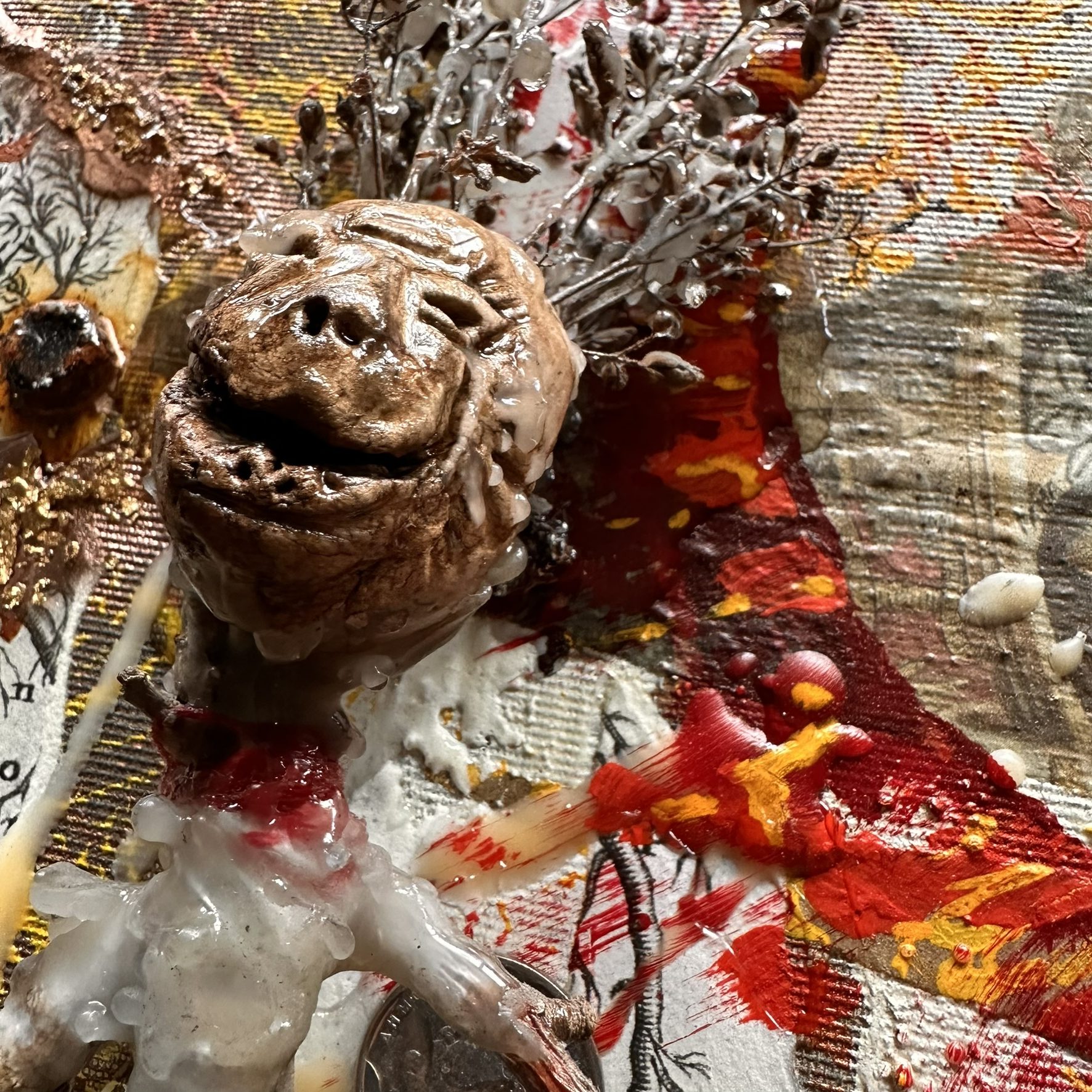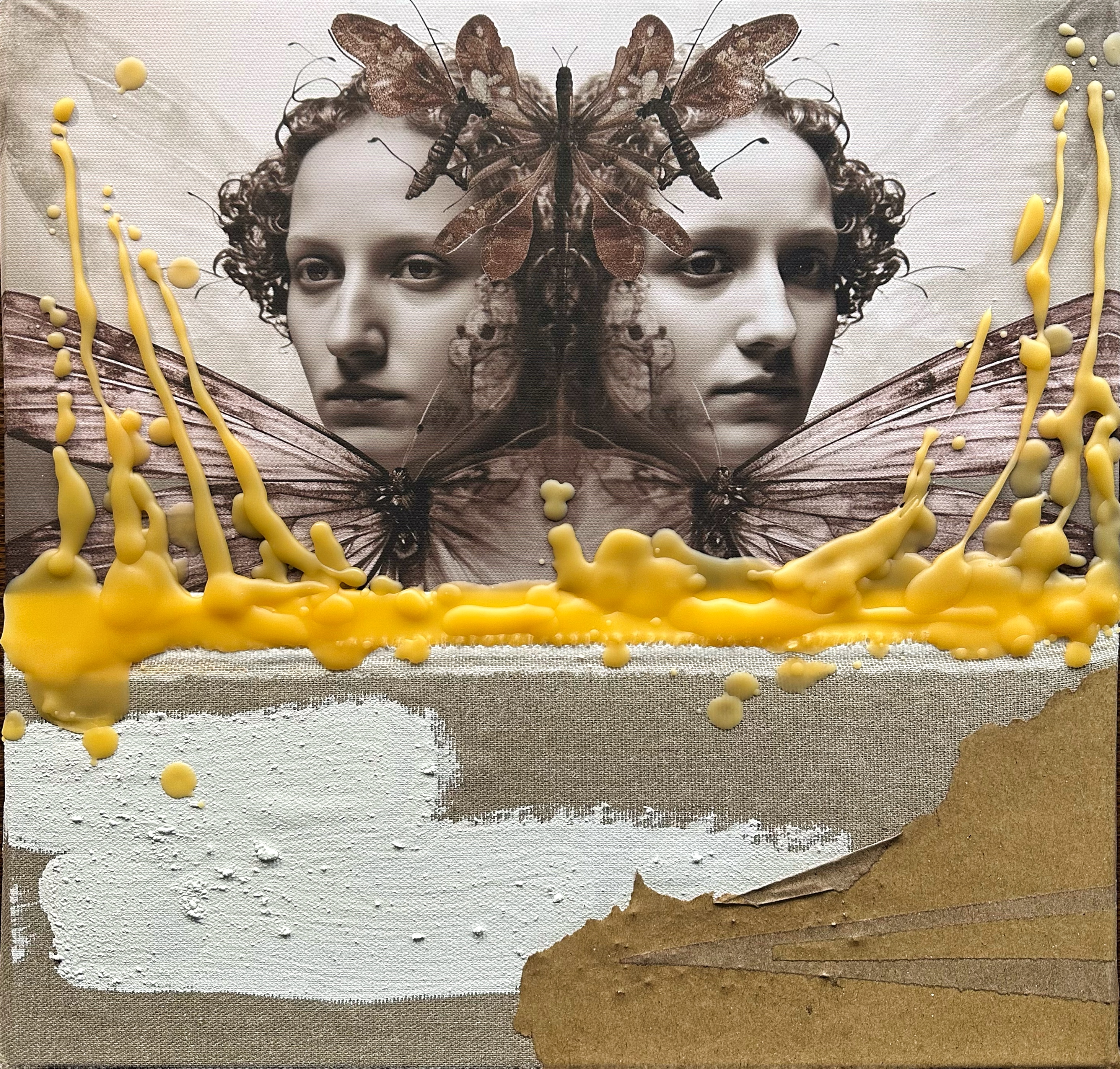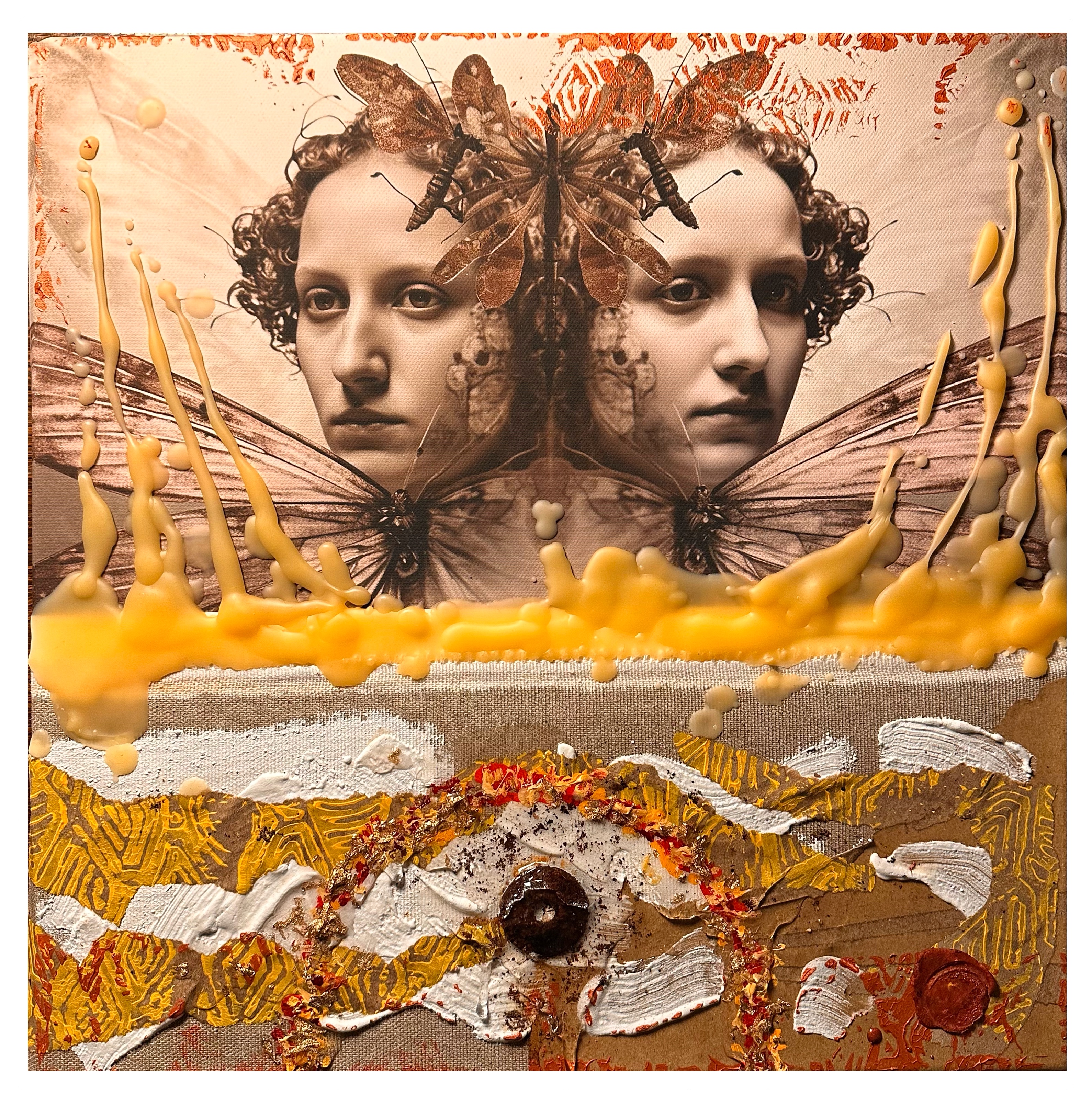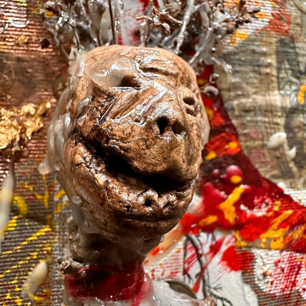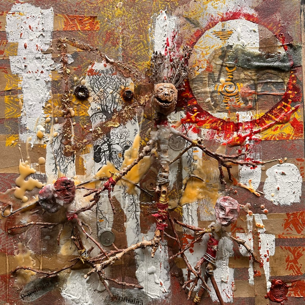 Mixed media with clay heads on canvas – 36 x 36″