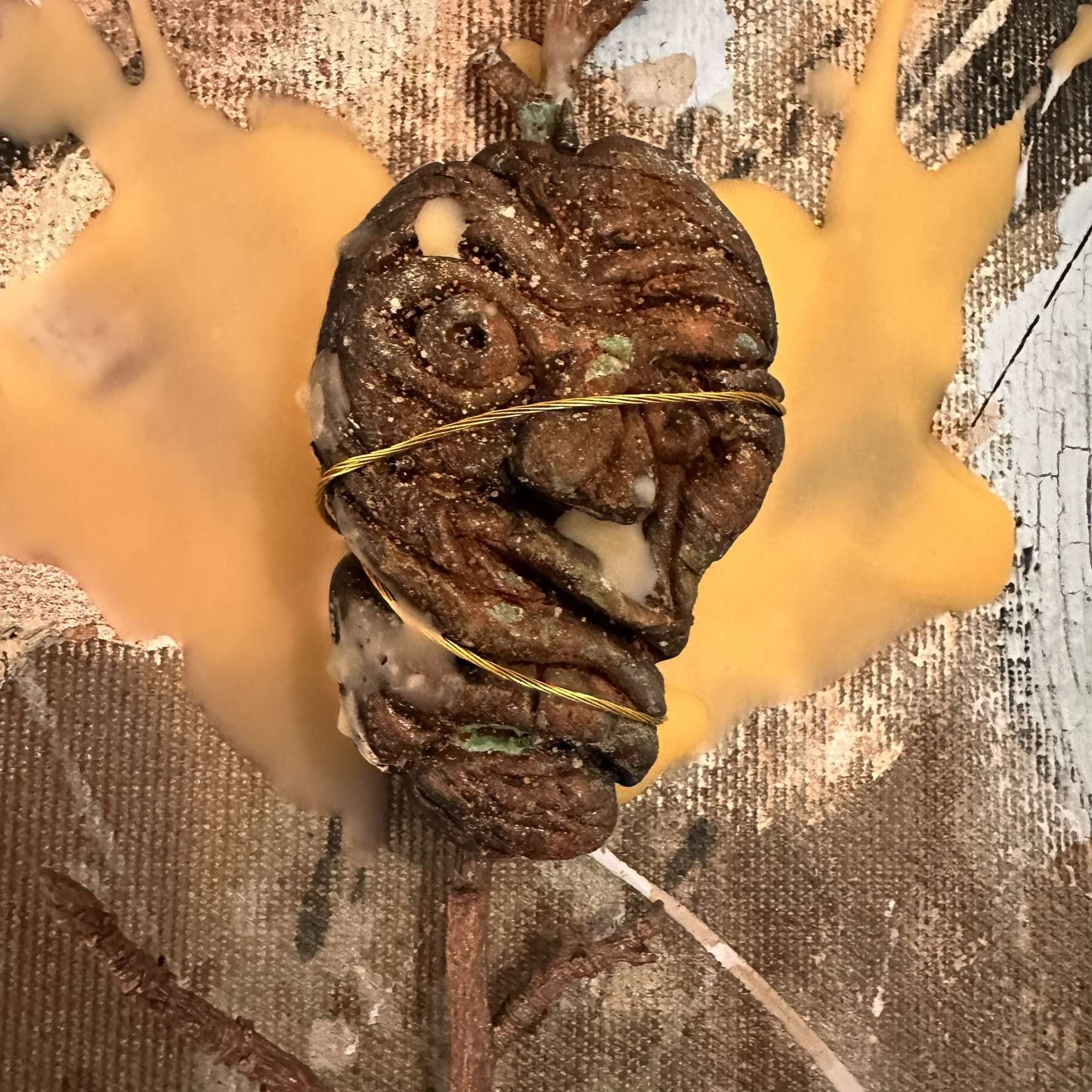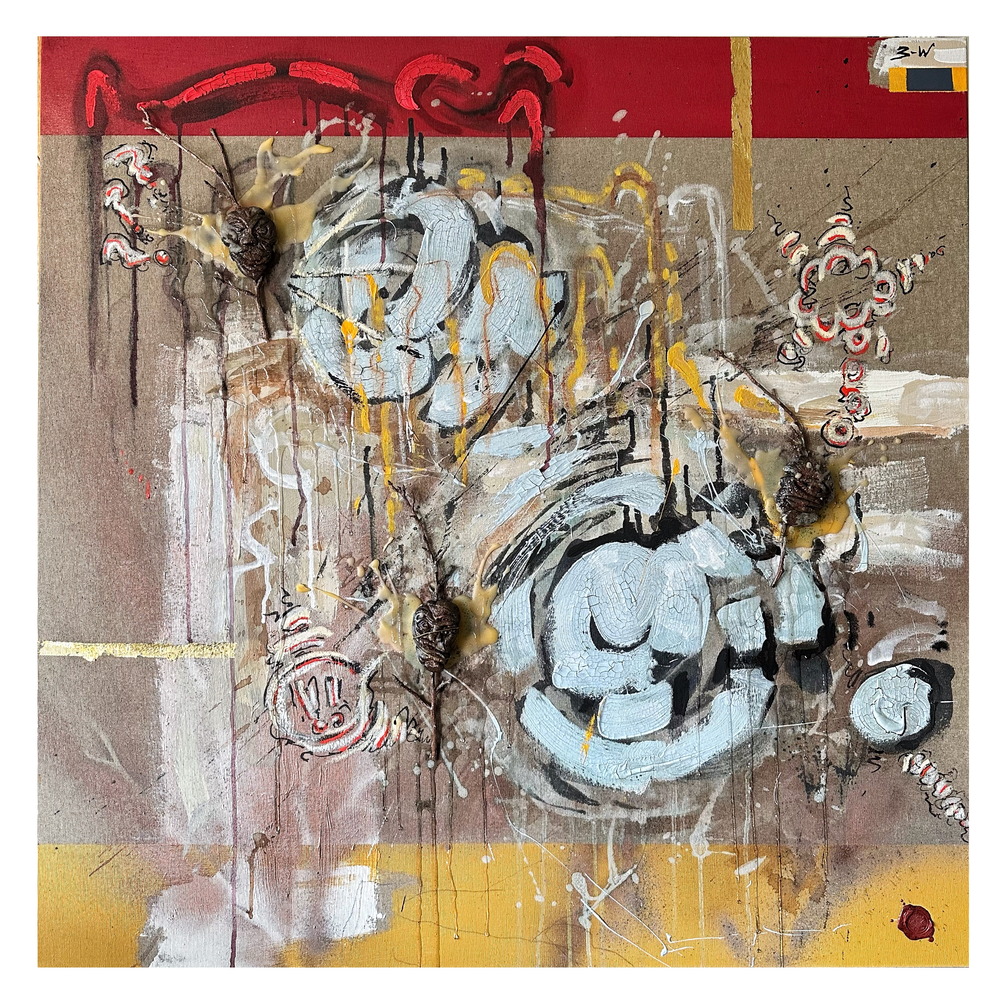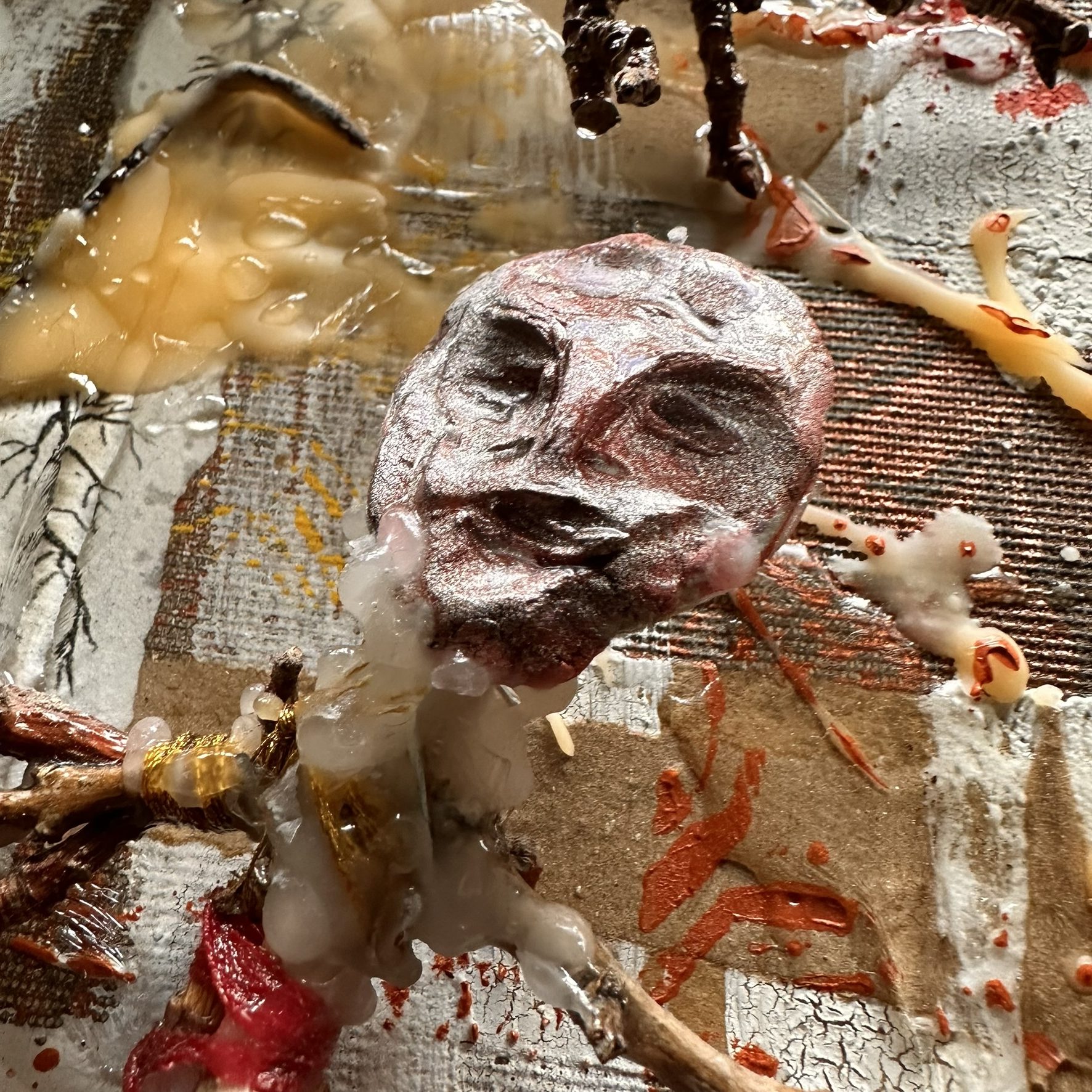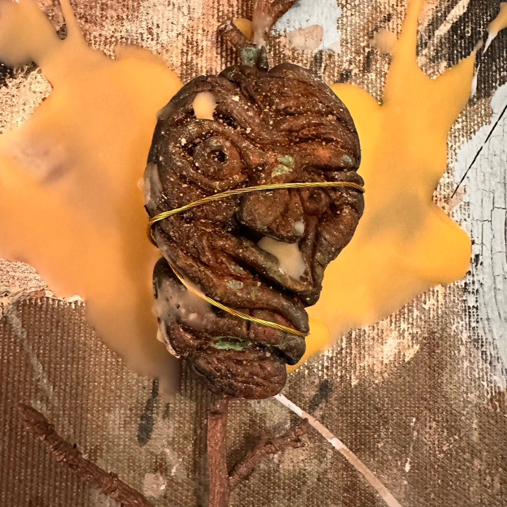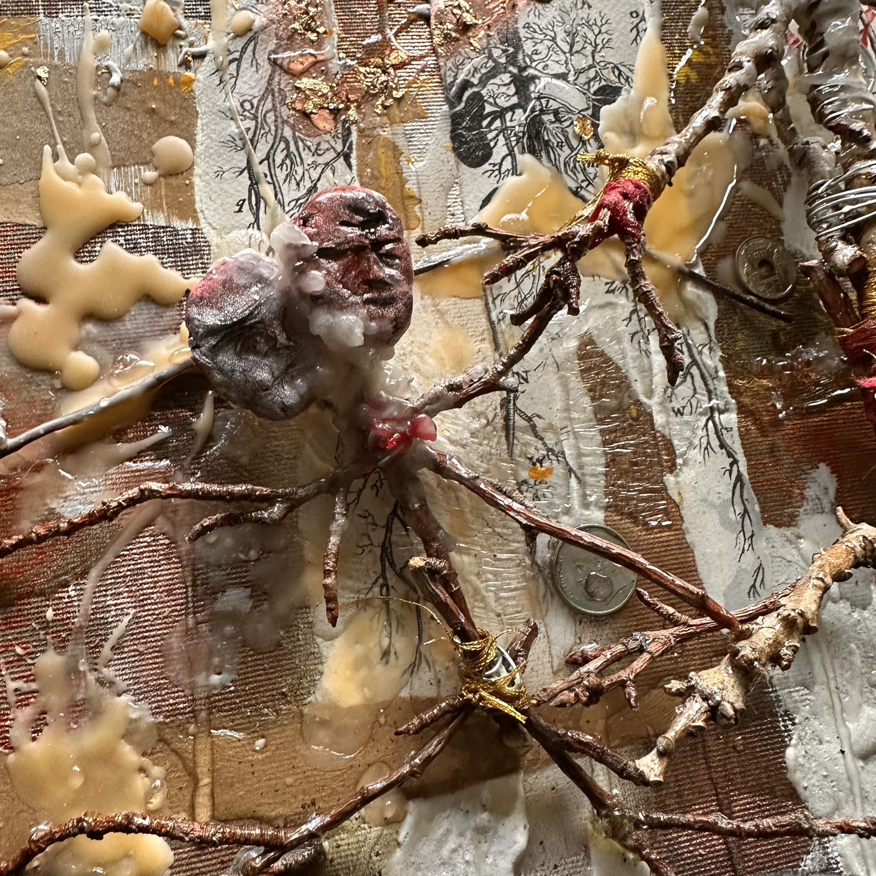 Mixed media with clay heads on canvas – 36 x 36″