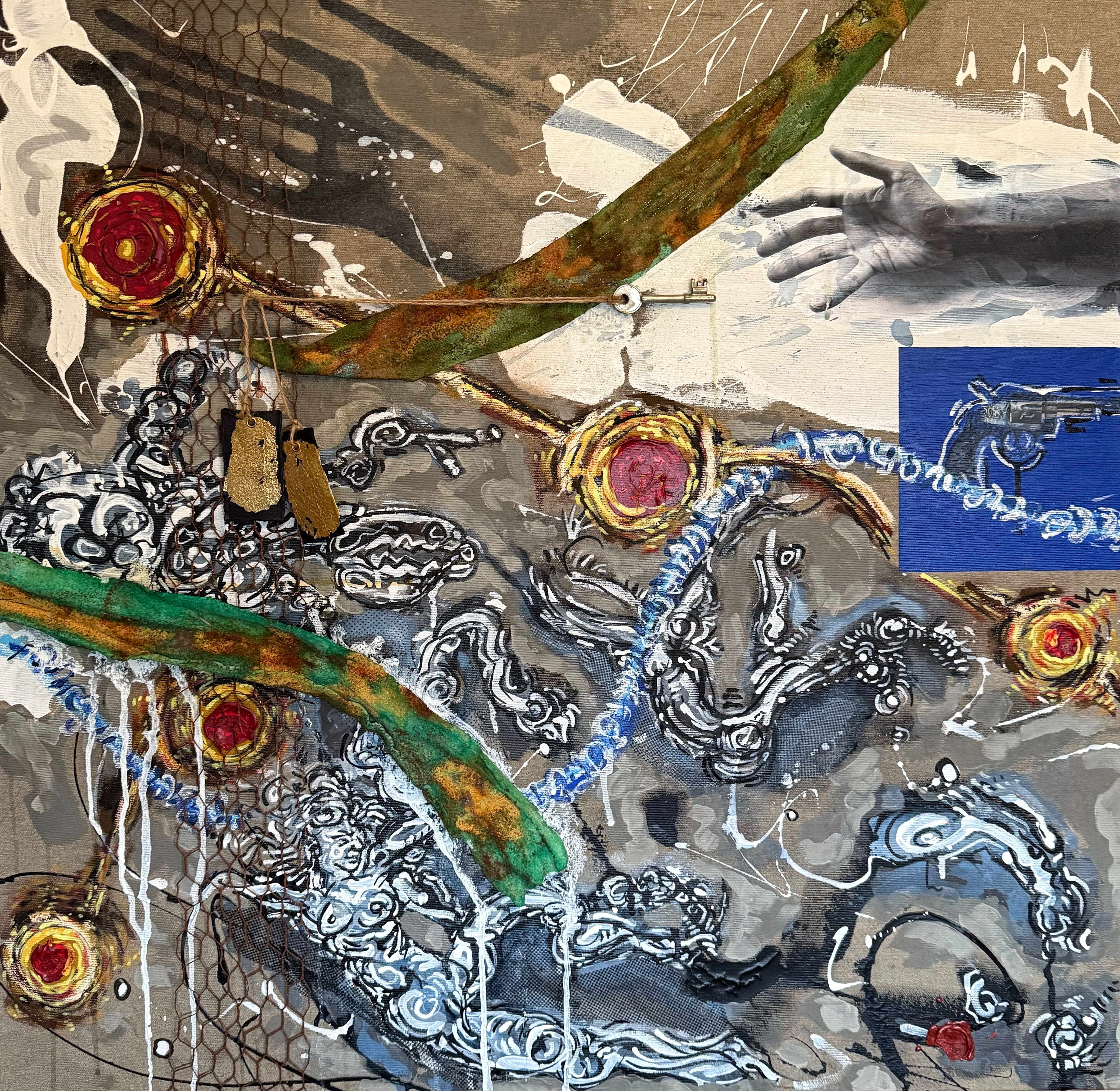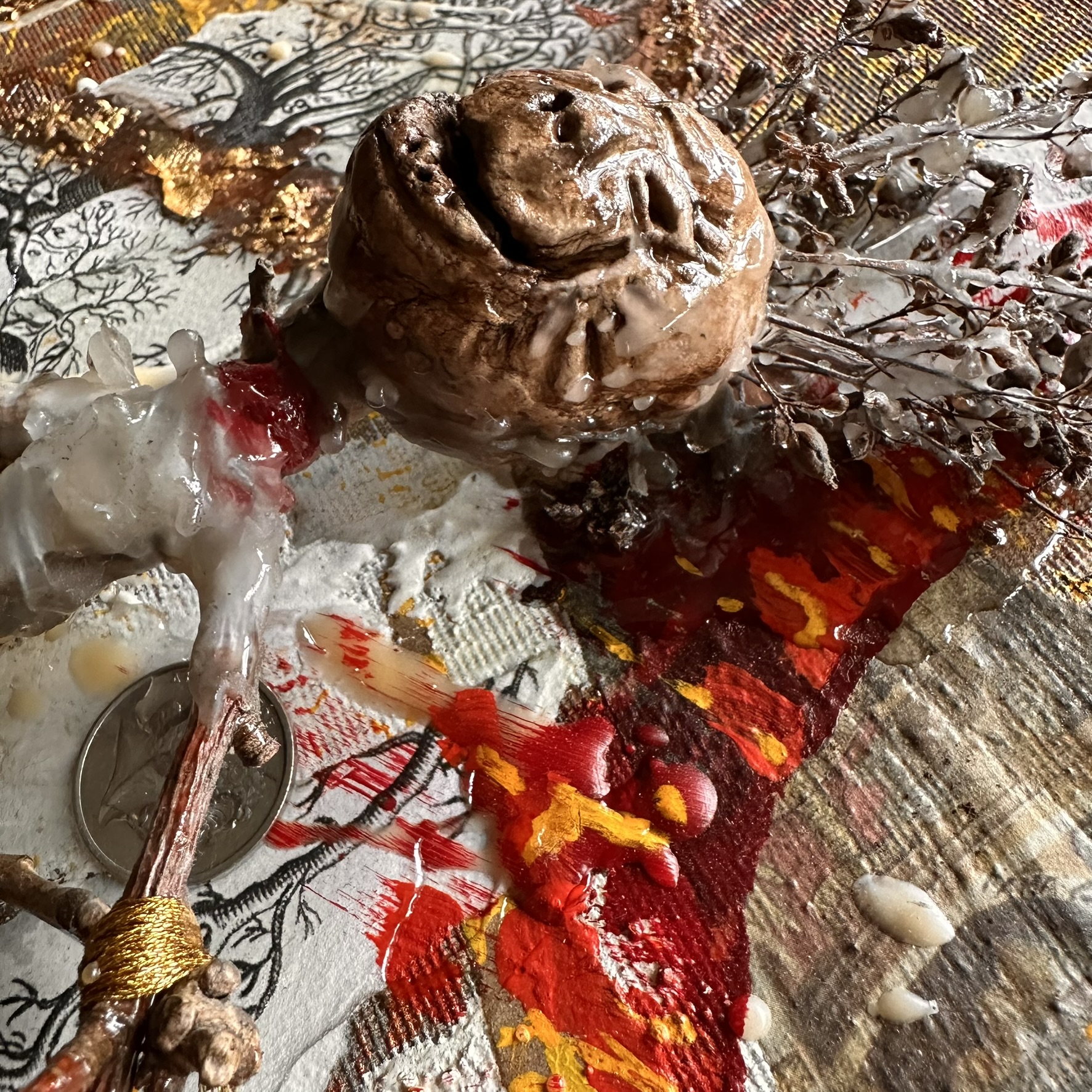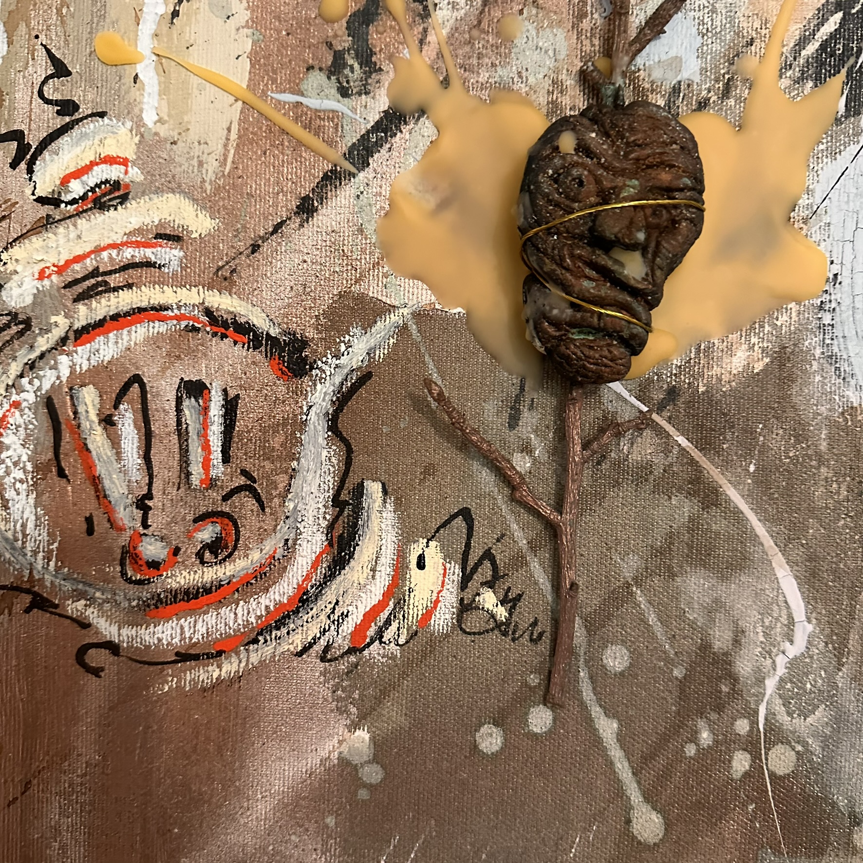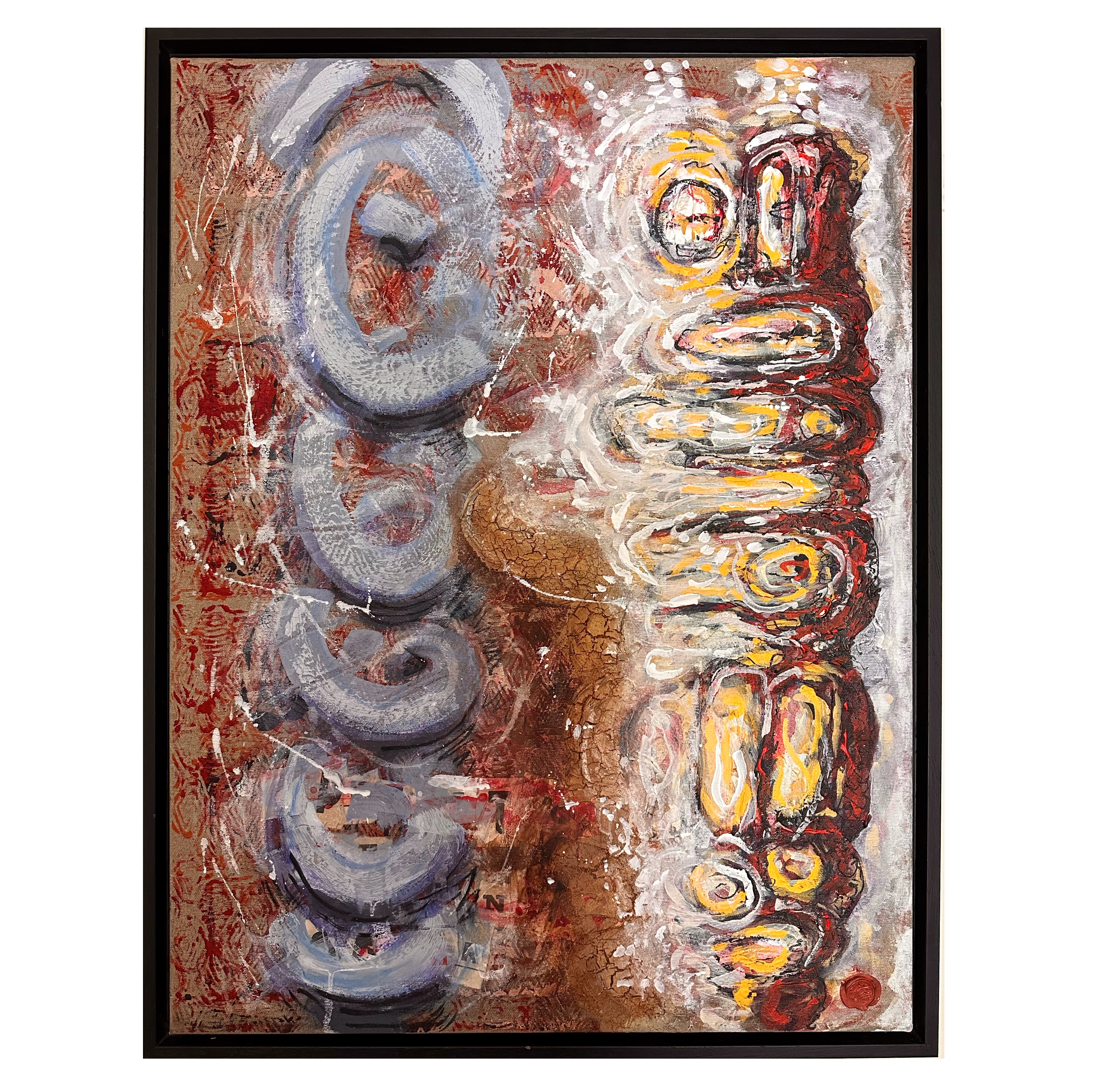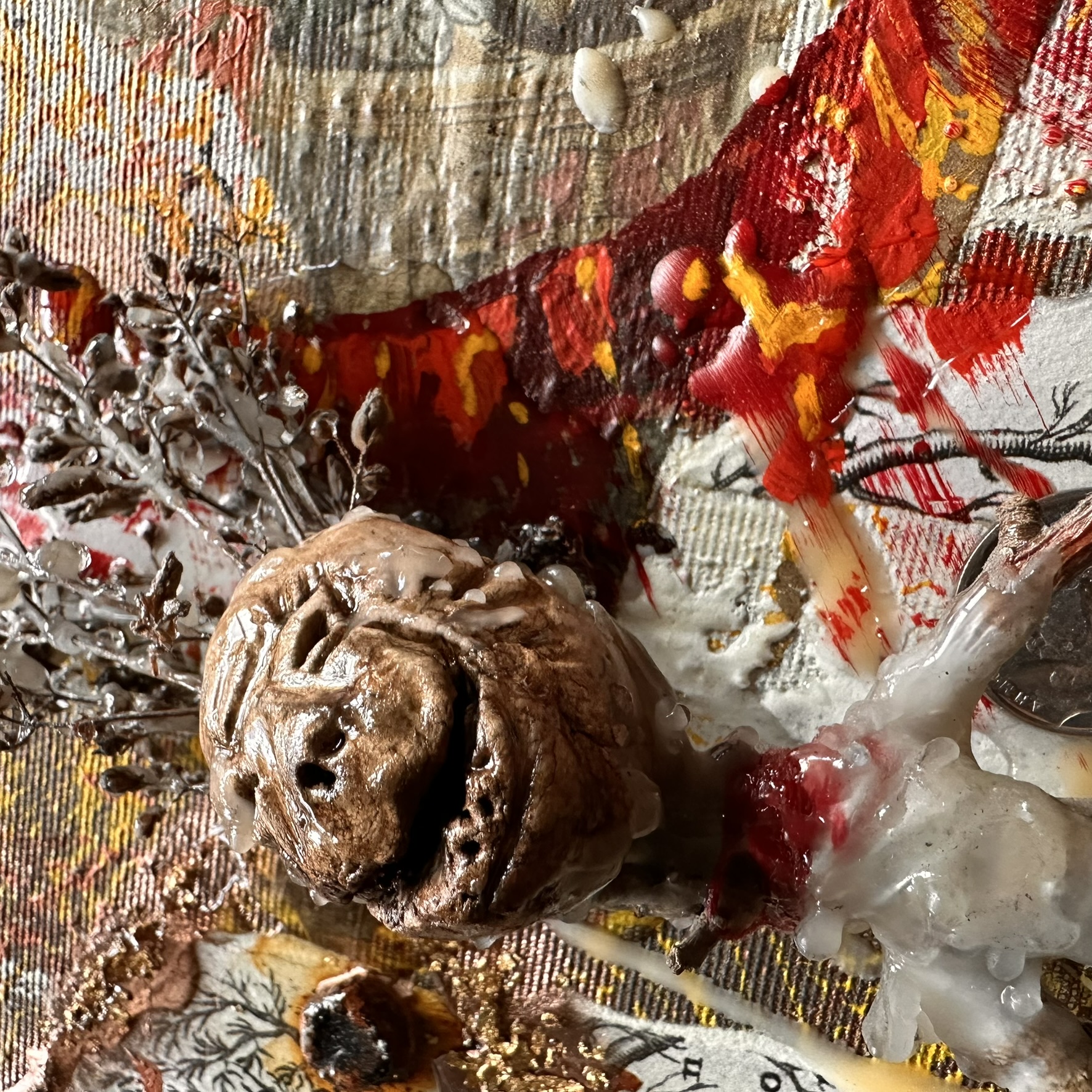 Mixed media with clay heads on canvas – 36 x 36″