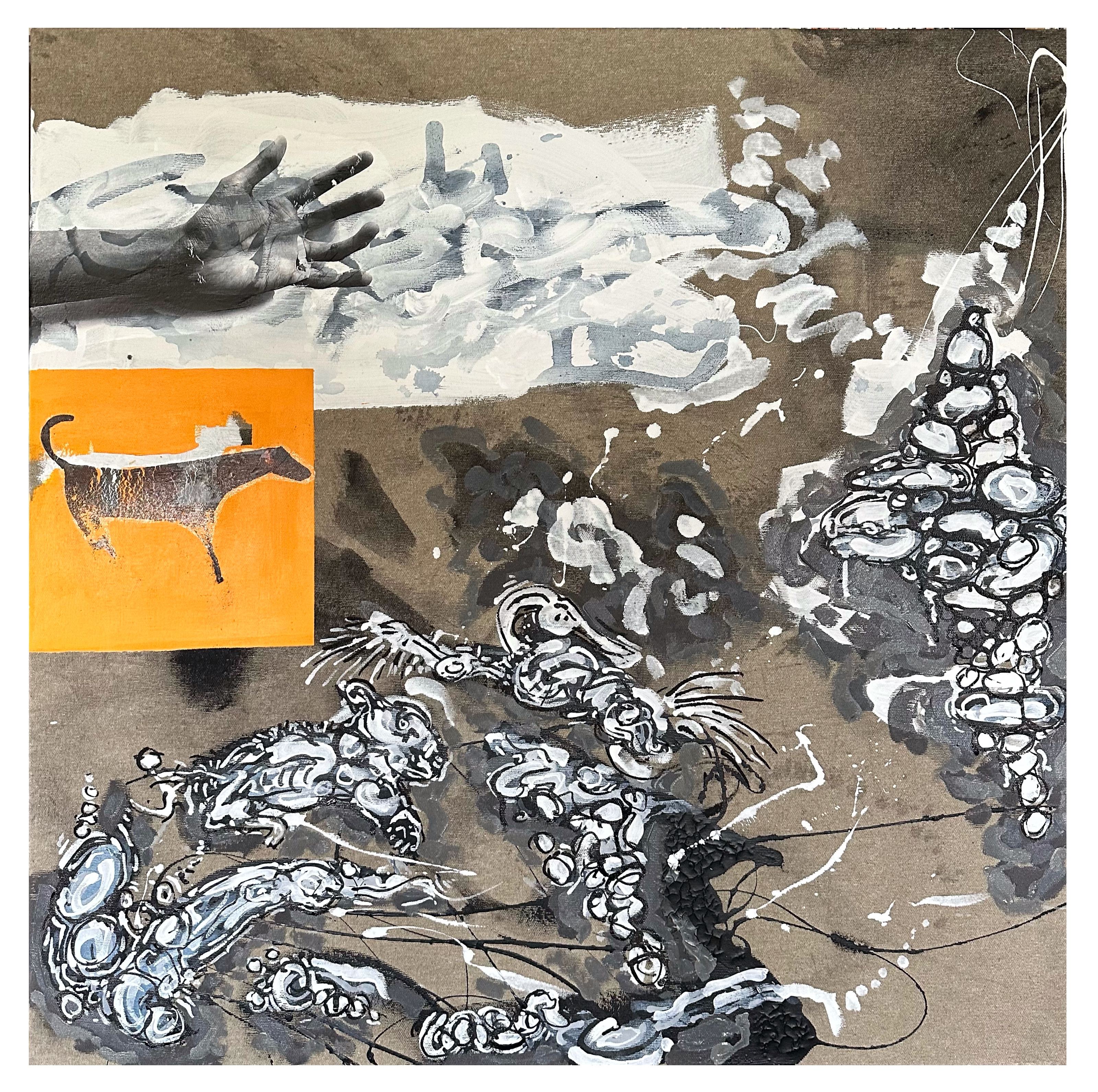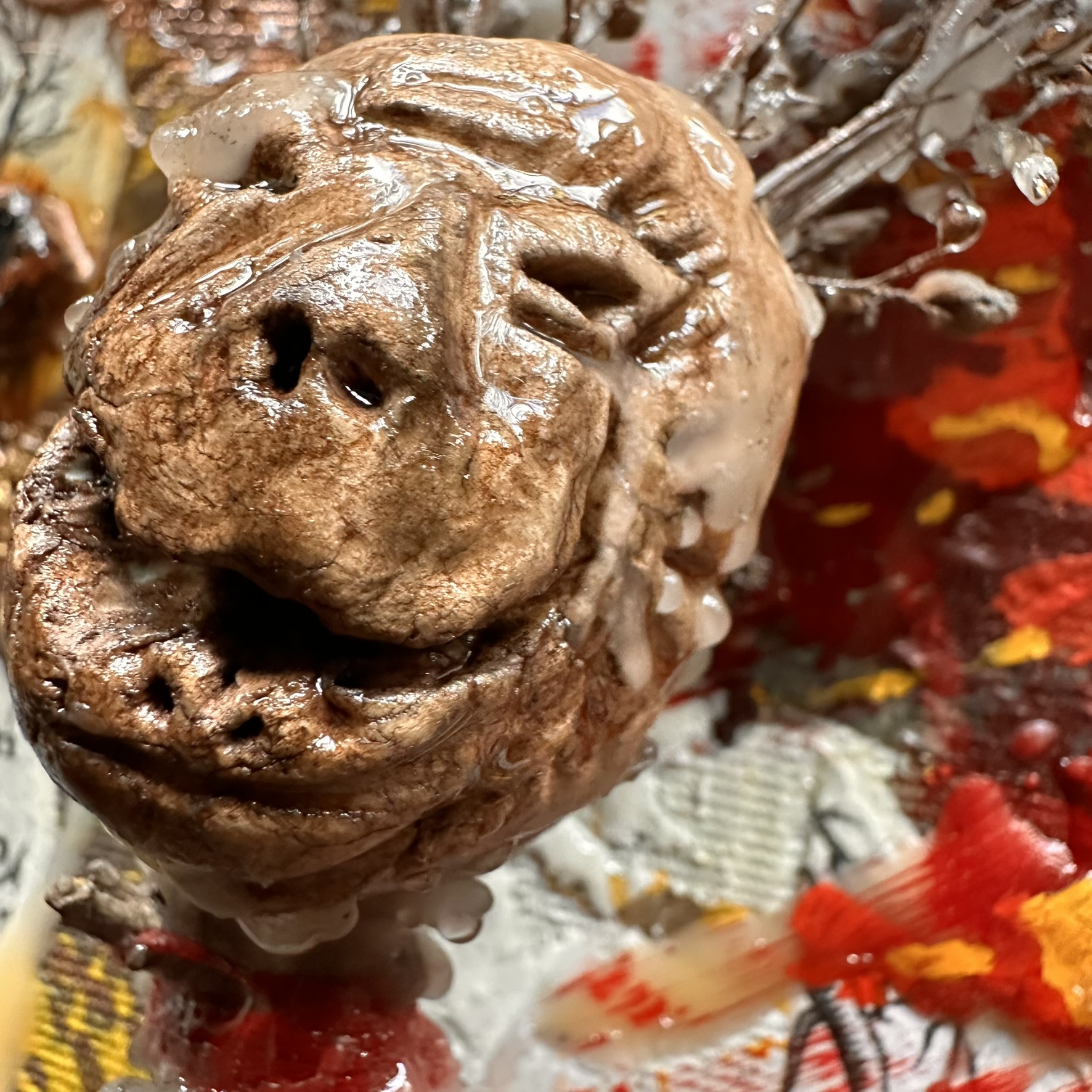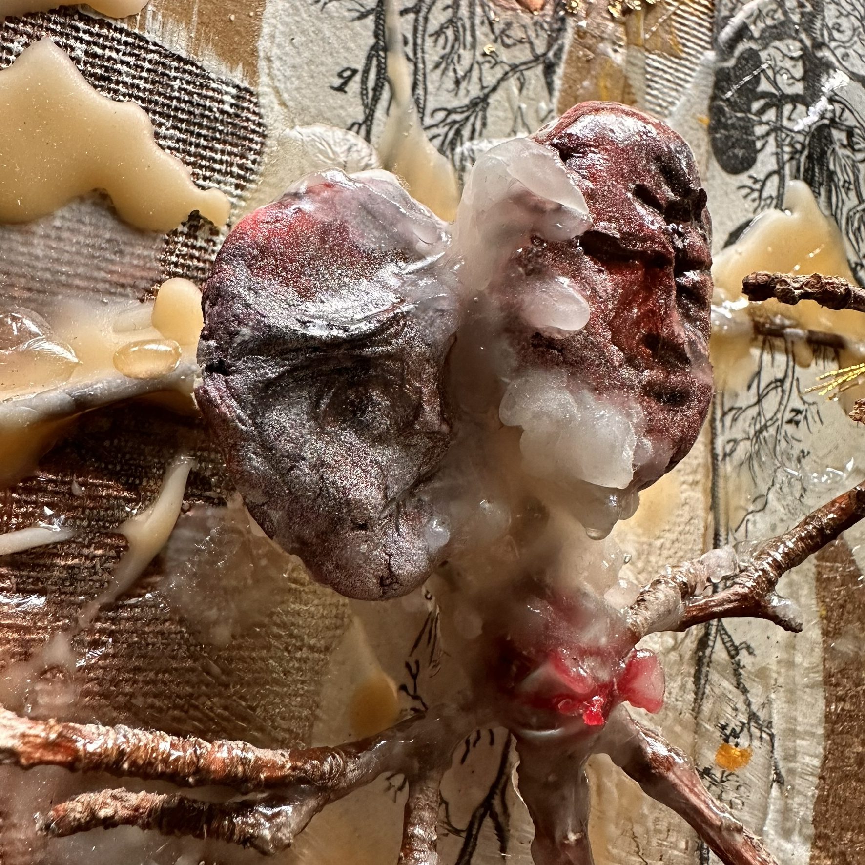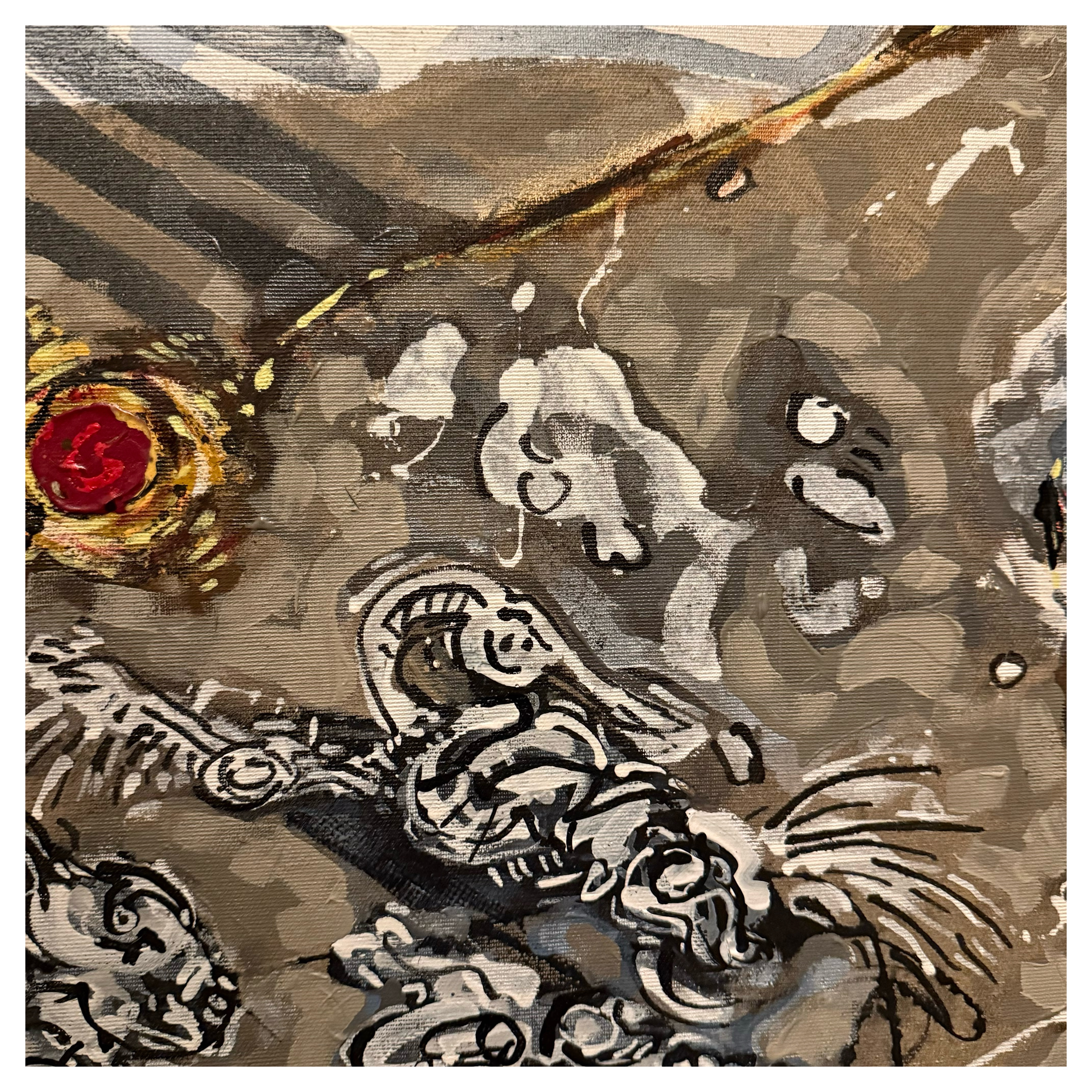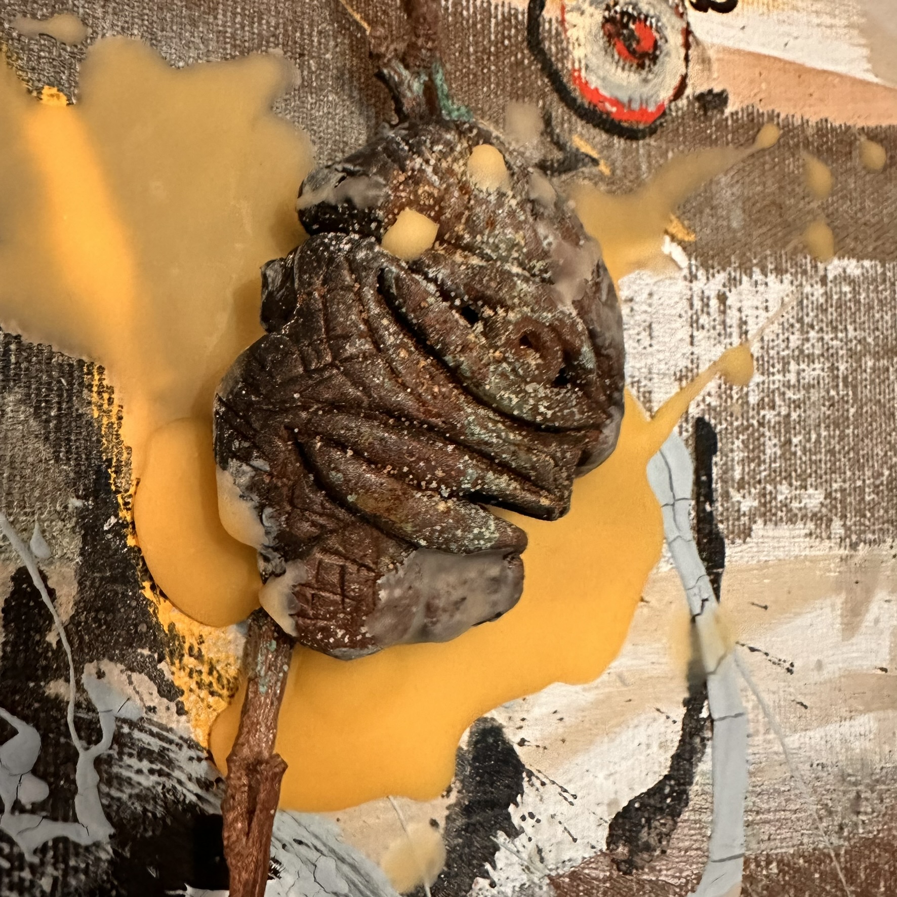 Mixed media with clay heads on canvas – 36 x 36″